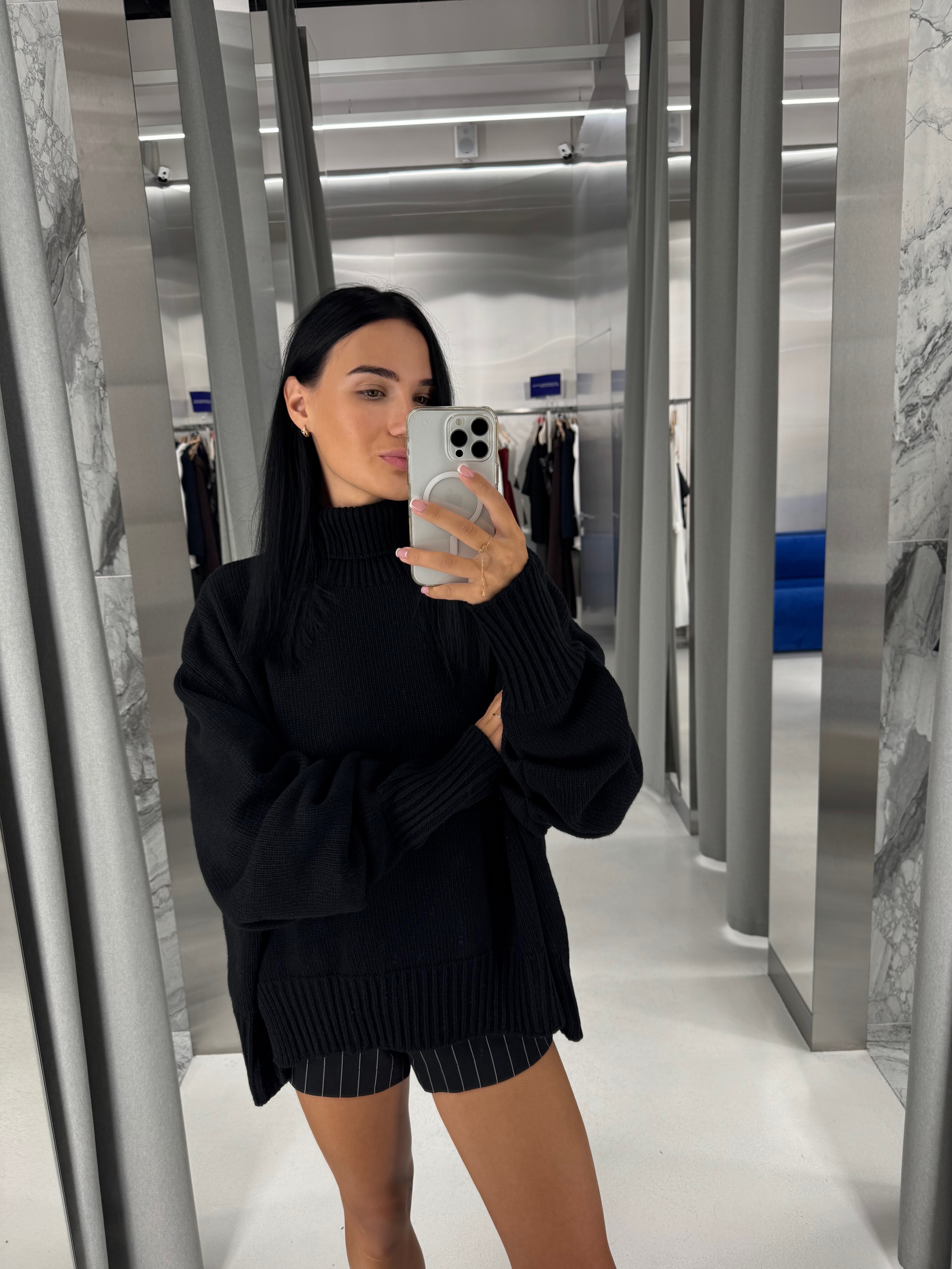 В'язаний джемпер чорного кольору з розрізами по низу — базова річ із сучасним акцентом. М'який трикотаж дарує комфорт у носінні, а розрізи з боків додають легкості та рухливості. Ідеально підходить для повсякденних образів у прохолодну погоду.