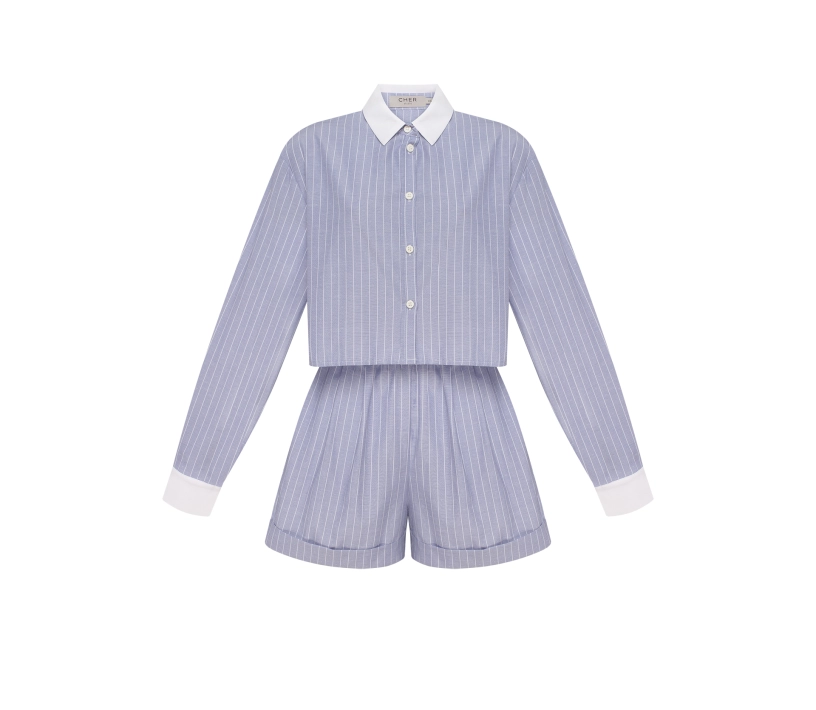 Ошатний, стильний й комфортний костюм. Сорочка-кроп має довгі рукава з манжетами, застібається на ґудзики. Виглядає стримано й охайно. Мінішорти дуже зручні, широкі, не сковують ваші рухи.