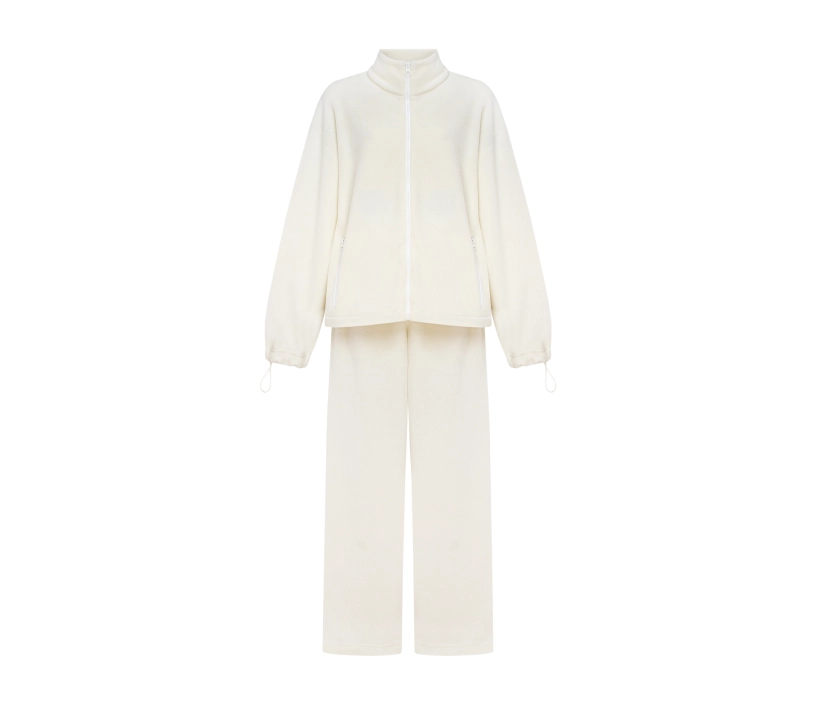 Елегантний та затишний спортивний костюм молочного кольору з флісової тканини — ідеальний вибір для прохолодної погоди. М’яка текстура та вільний крій гарантують комфорт і свободу рухів, а ніжний відтінок додає легкості та стилю в образ. Чудово підходить для активного відпочинку або створення стильного casual луку.