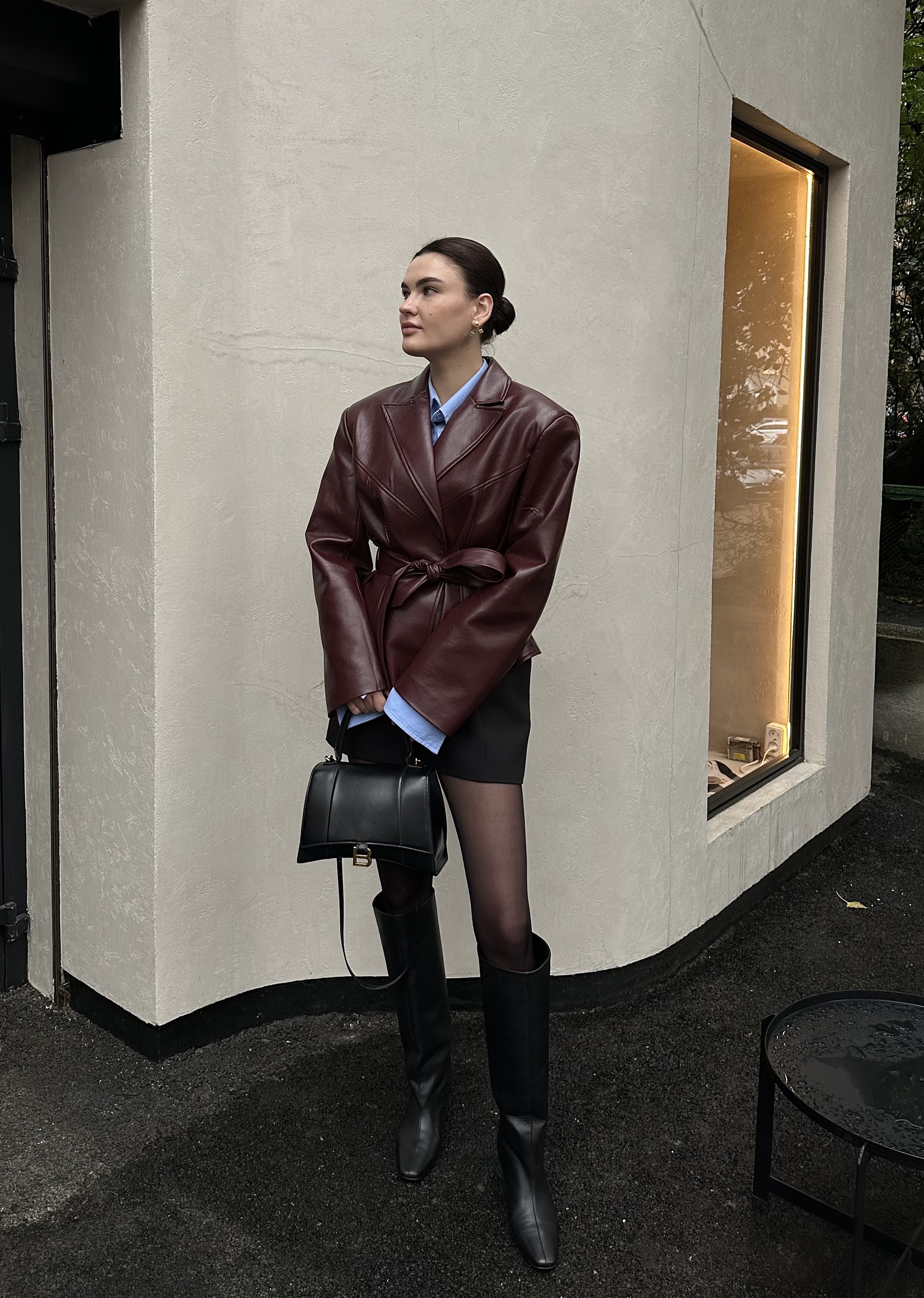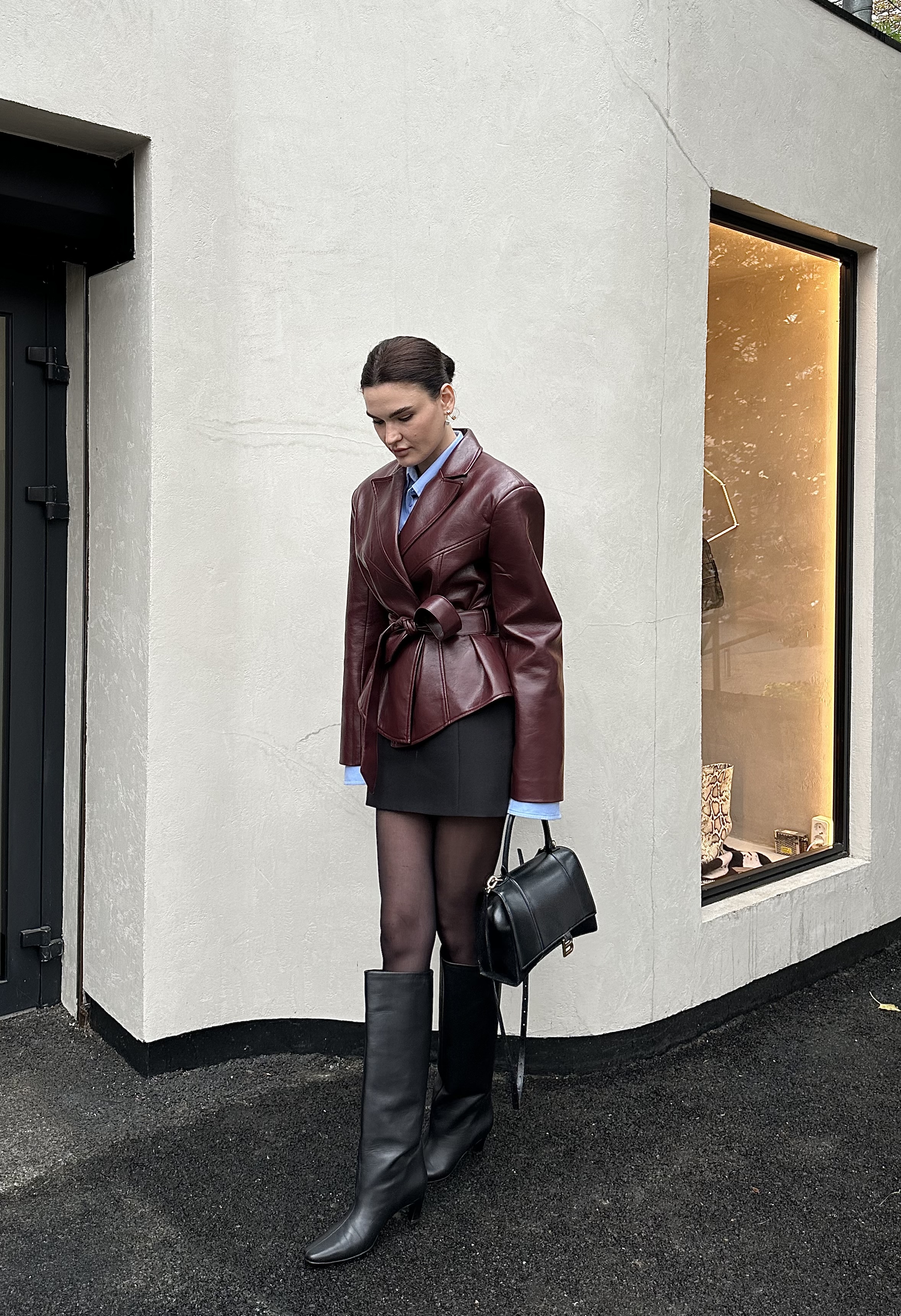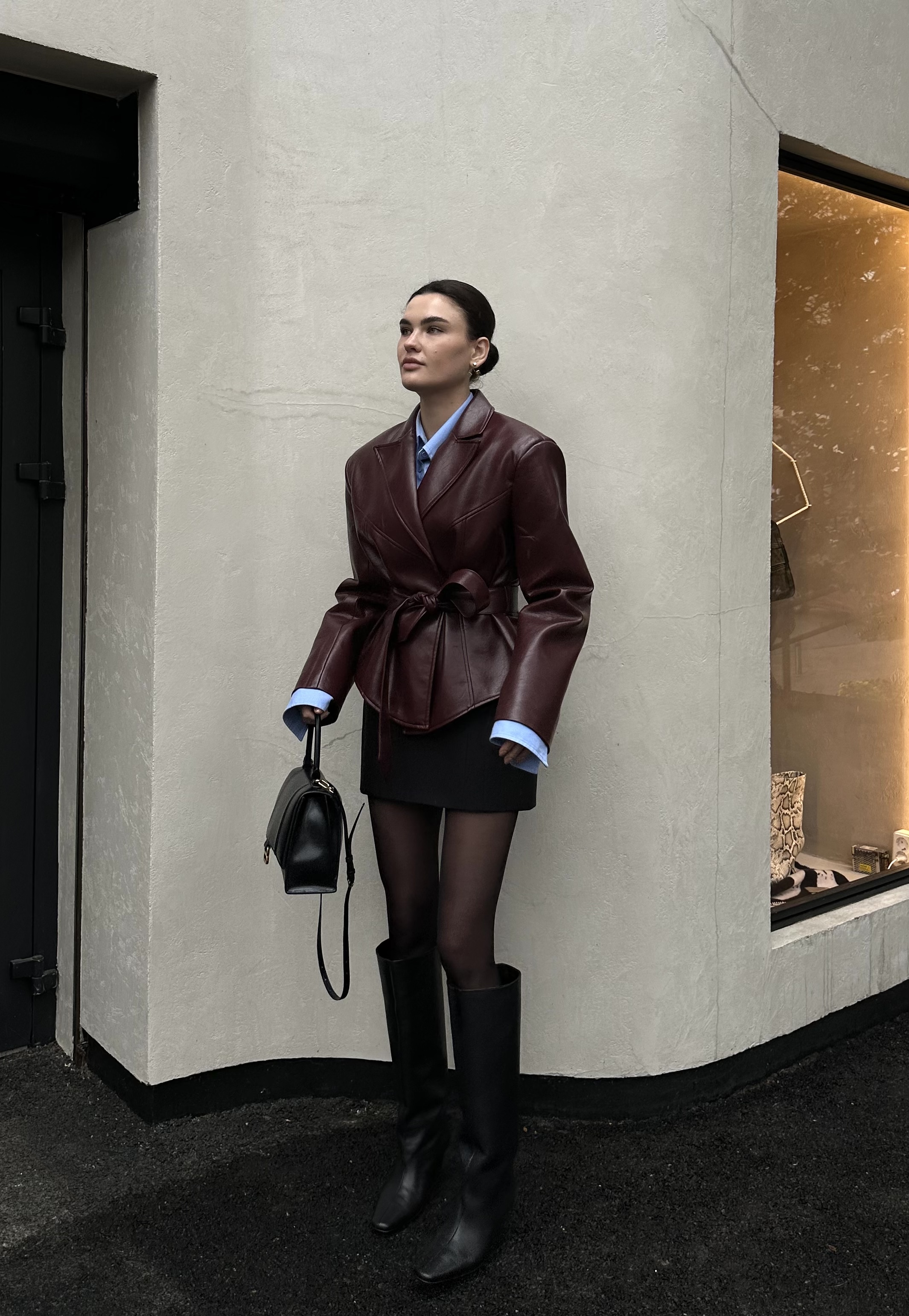 Шкіряна куртка з акцентними плечима у відтінку бургунді — стильний і виразний елемент гардероба. Ефектний силует і насичений колір додають образу характеру та впевненості.