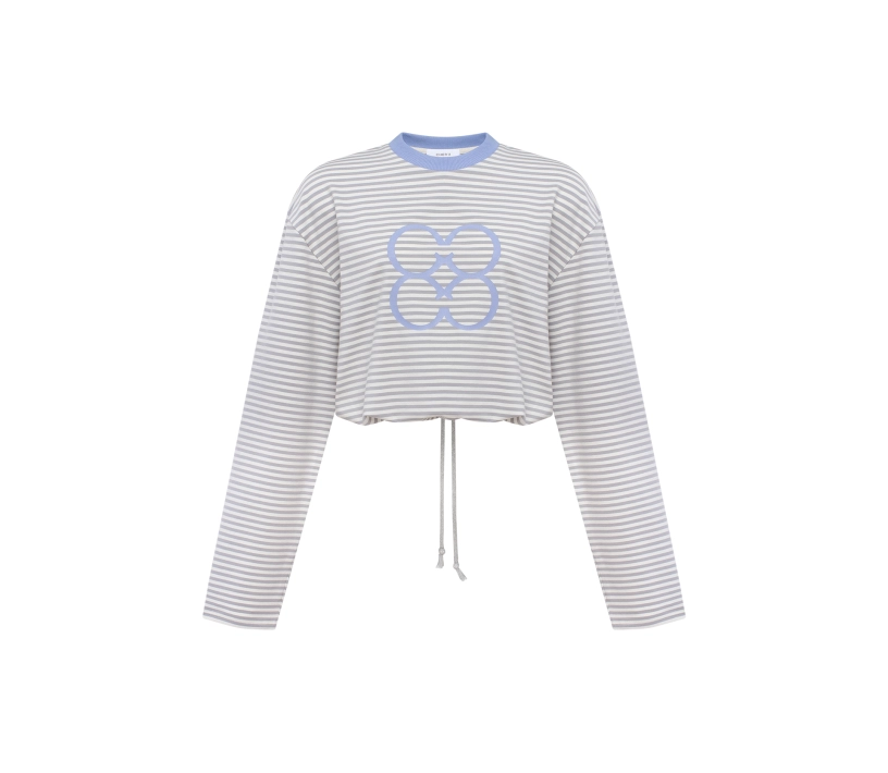 Смугастий лонгслів сірого кольору на кулісці з принтованим лого — поєднання зручності та стильного дизайну. Регульований низ дозволяє змінювати силует, а стриманий принт додає характеру повсякденному образу.
