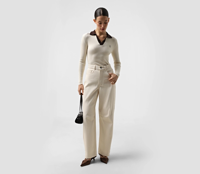 В’язаний лонгслів молочного кольору з контрастним коміром і лого — стильний і комфортний варіант для повсякденних образів. Контрастний комір додає виразності, а лого підкреслює брендований стиль. Ідеально підходить для casual-луків з акцентом на деталі.