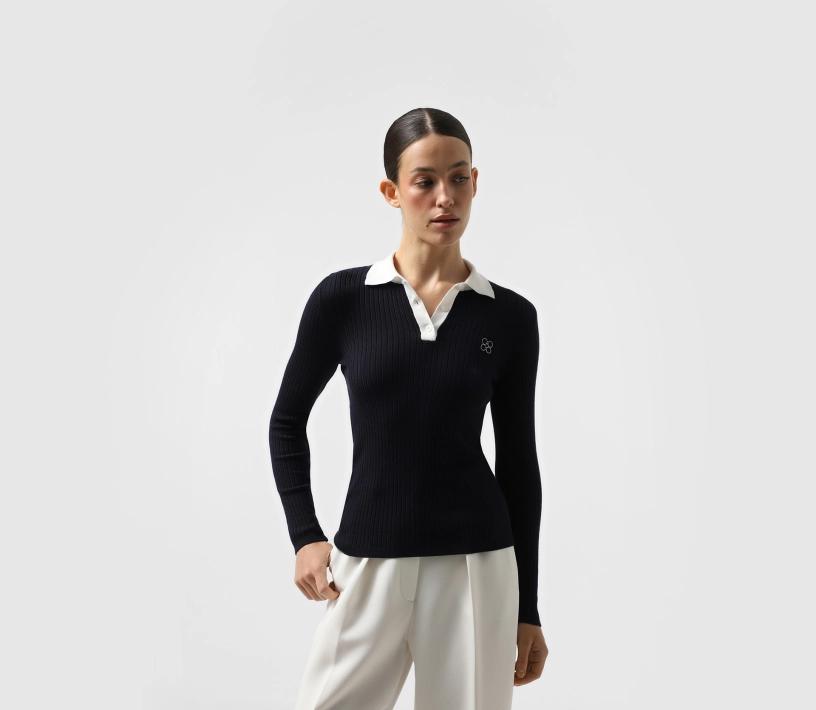 В’язаний темно-синій лонгслів з контрастним коміром і лого — стильна база для сучасного гардероба. Комір додає виразності, а лаконічне лого підкреслює брендований характер виробу. Ідеальний для повсякденних образів із акцентом на деталі.