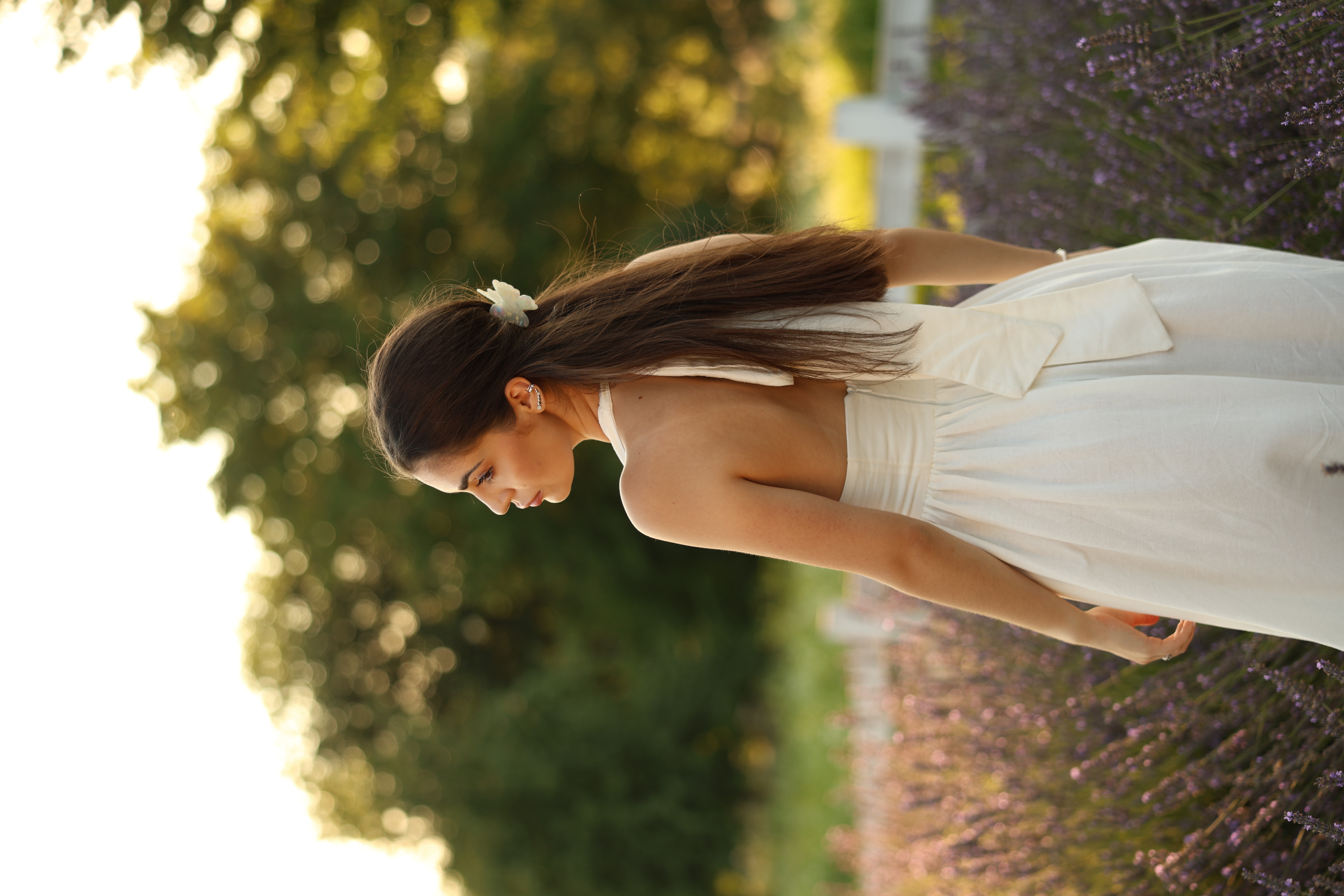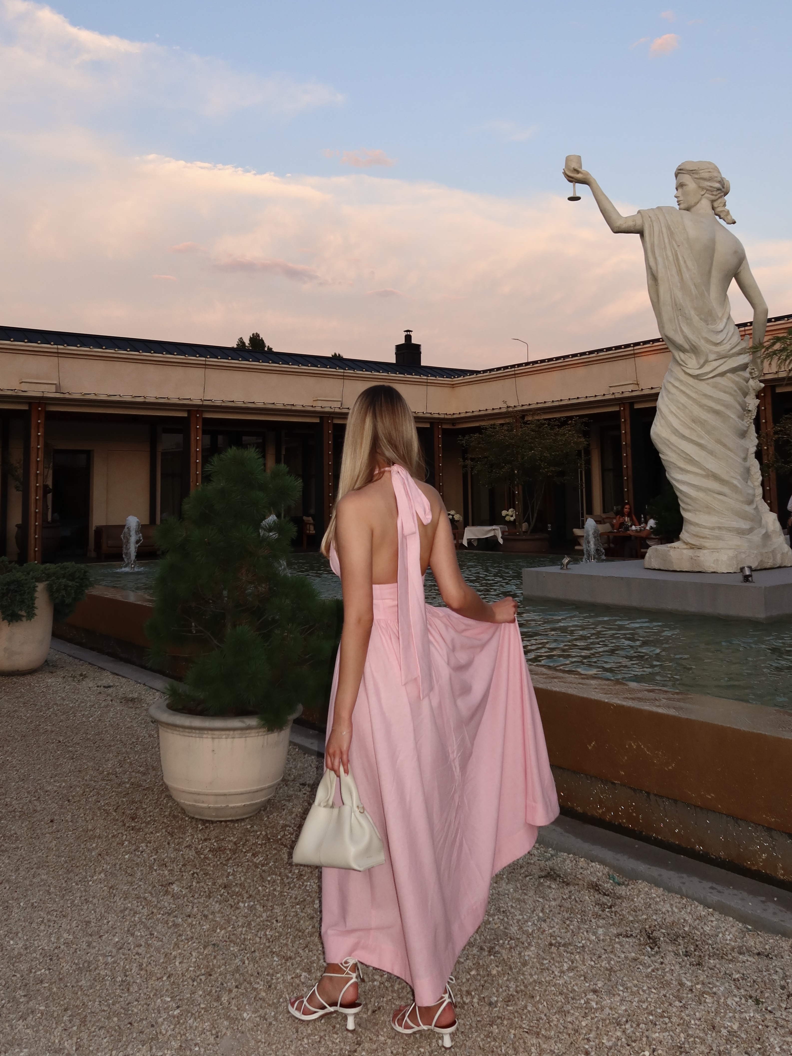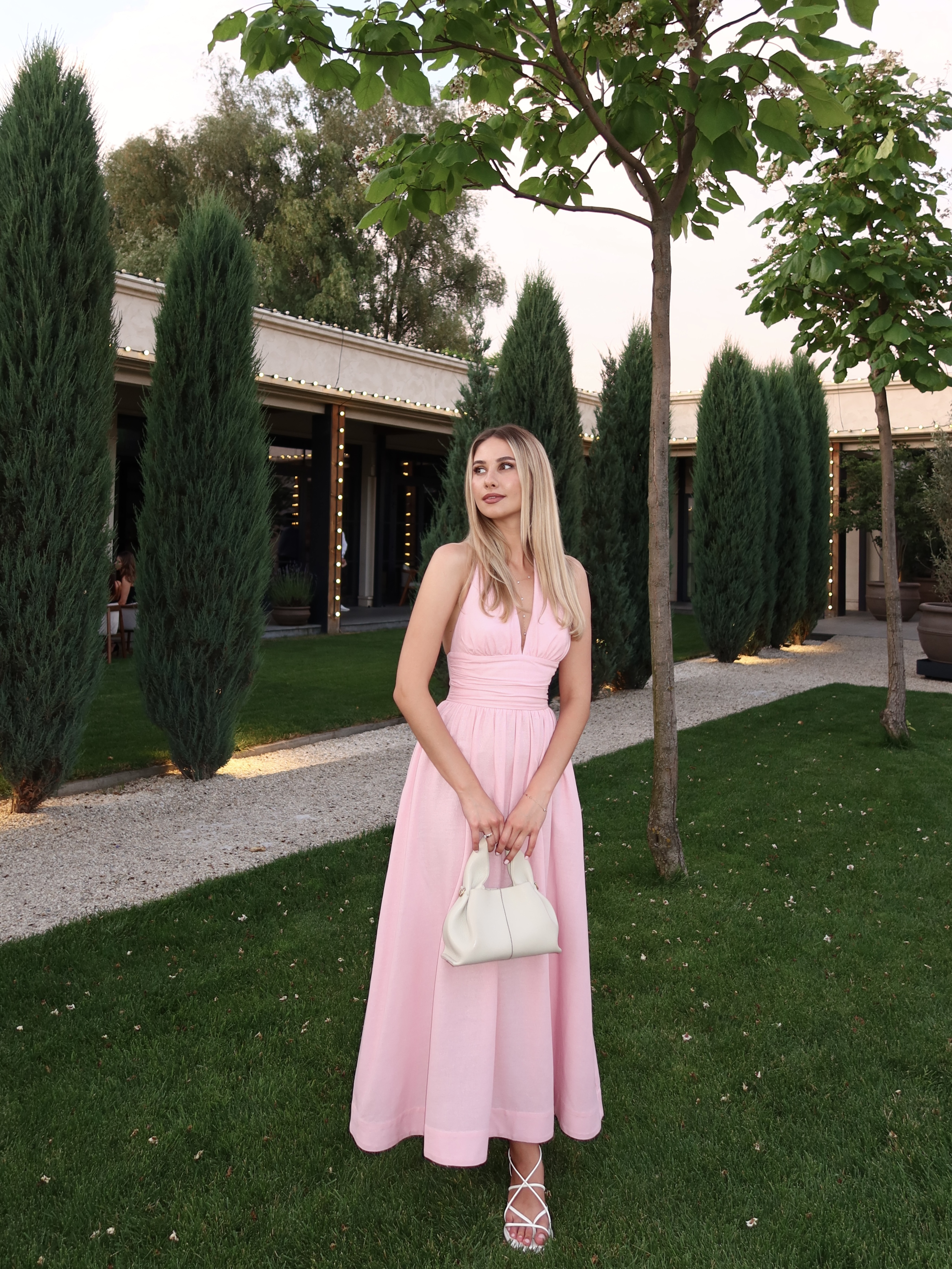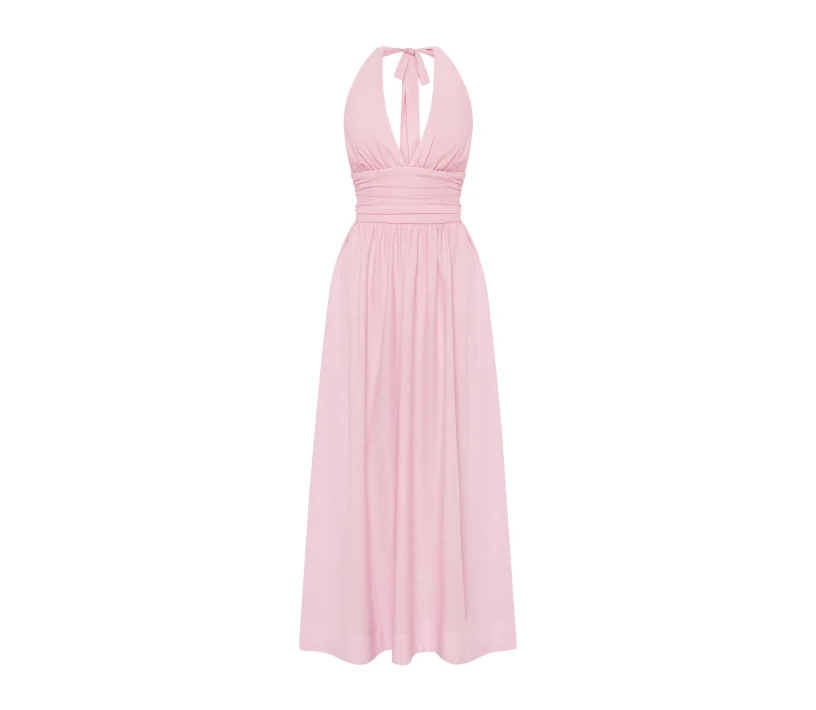 Міді сарафан із зав’язкою на шиї та відкритими плечима. Виконаний із легкої дихаючої тканини, має плавний силует і об'ємну спідницю. Ідеальний варіант для літа — жіночний, зручний і стильний.