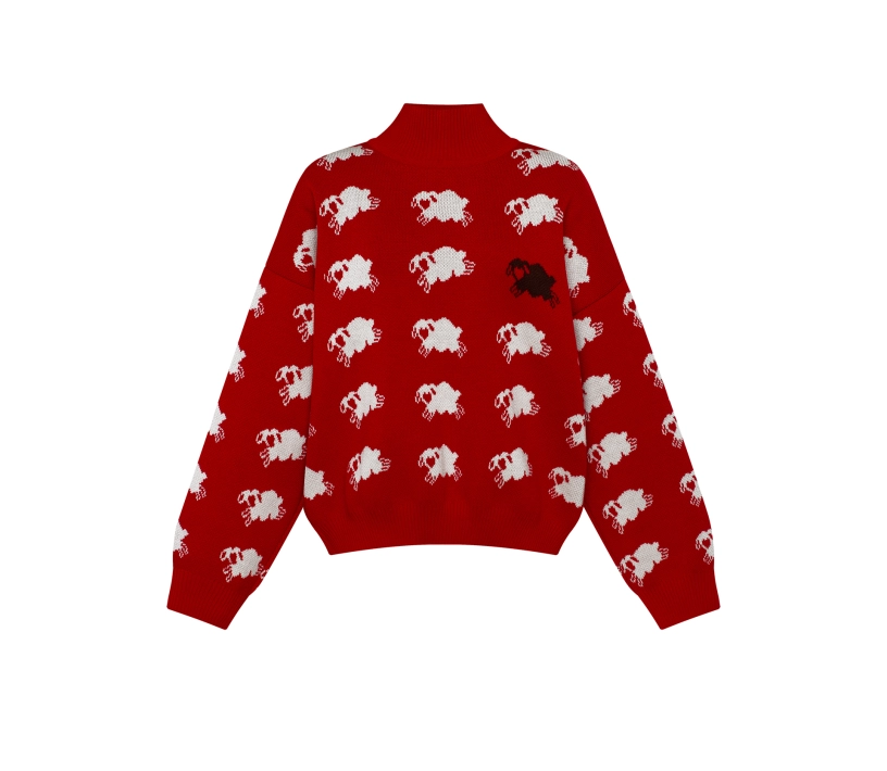Яскравий червоний светр із милим в’язаним патерном у вигляді овець — теплий акцент у вашому гардеробі. М’яка пряжа дарує комфорт, а креативний дизайн додає настрою. Ідеально підходить для затишних образів у холодну пору року.